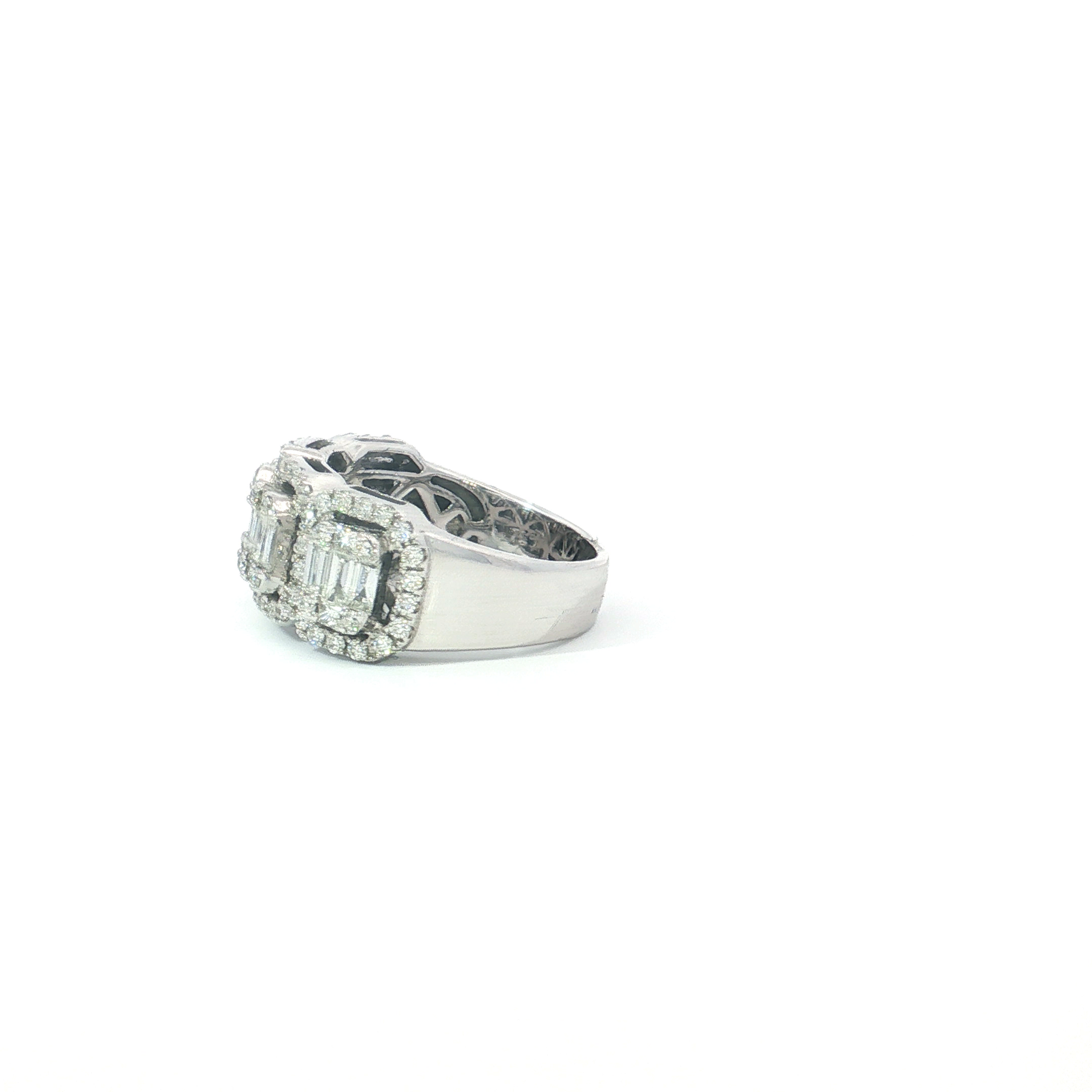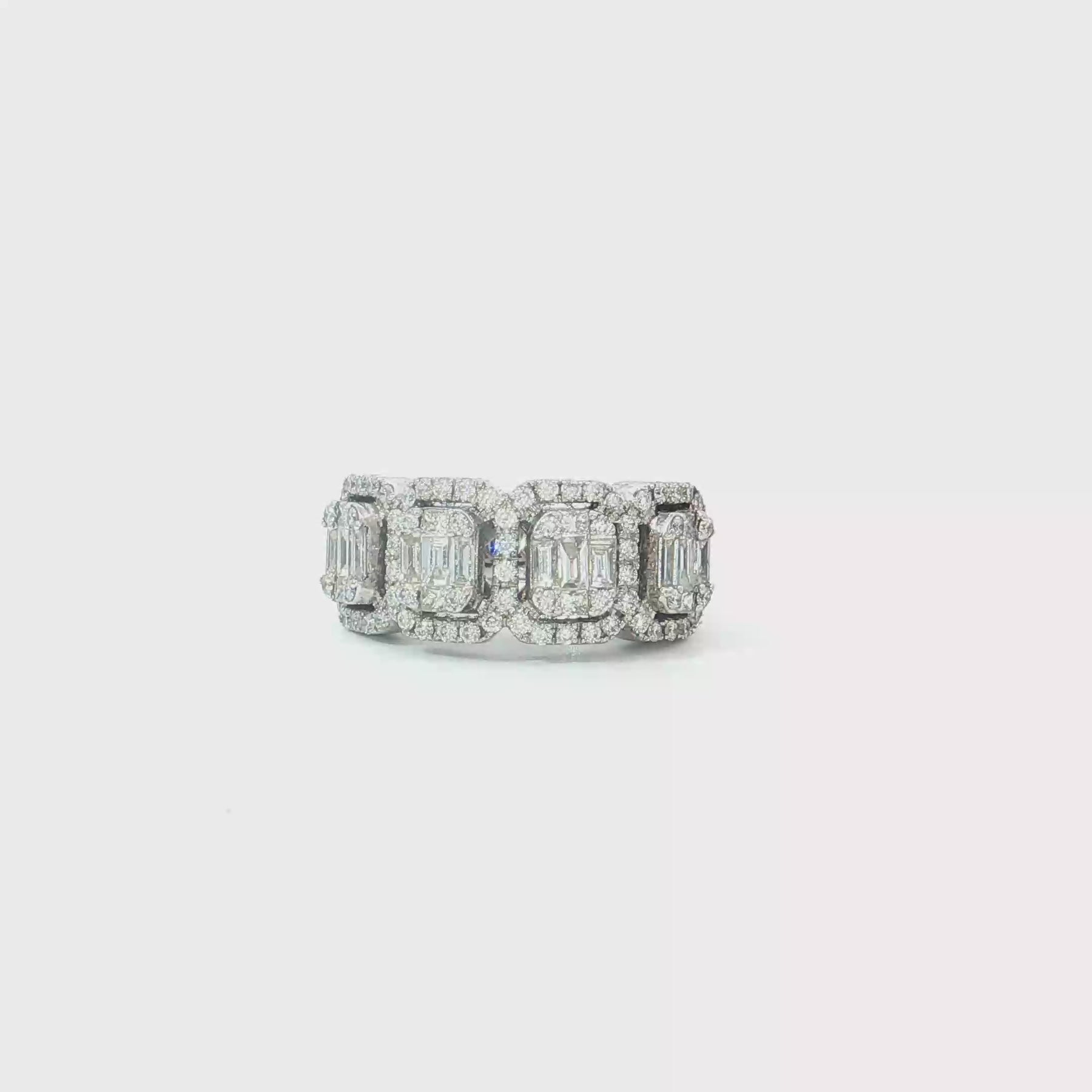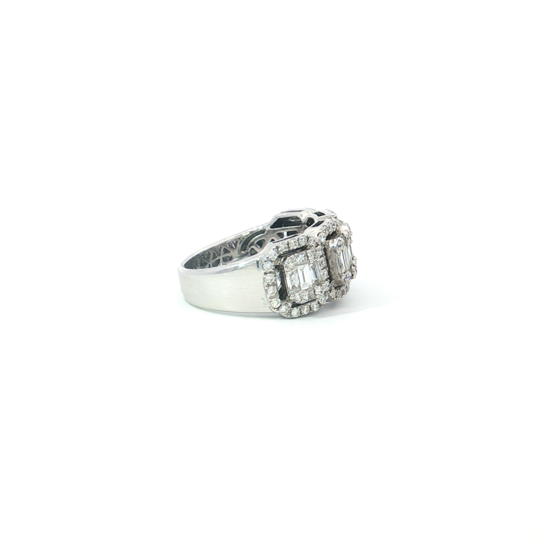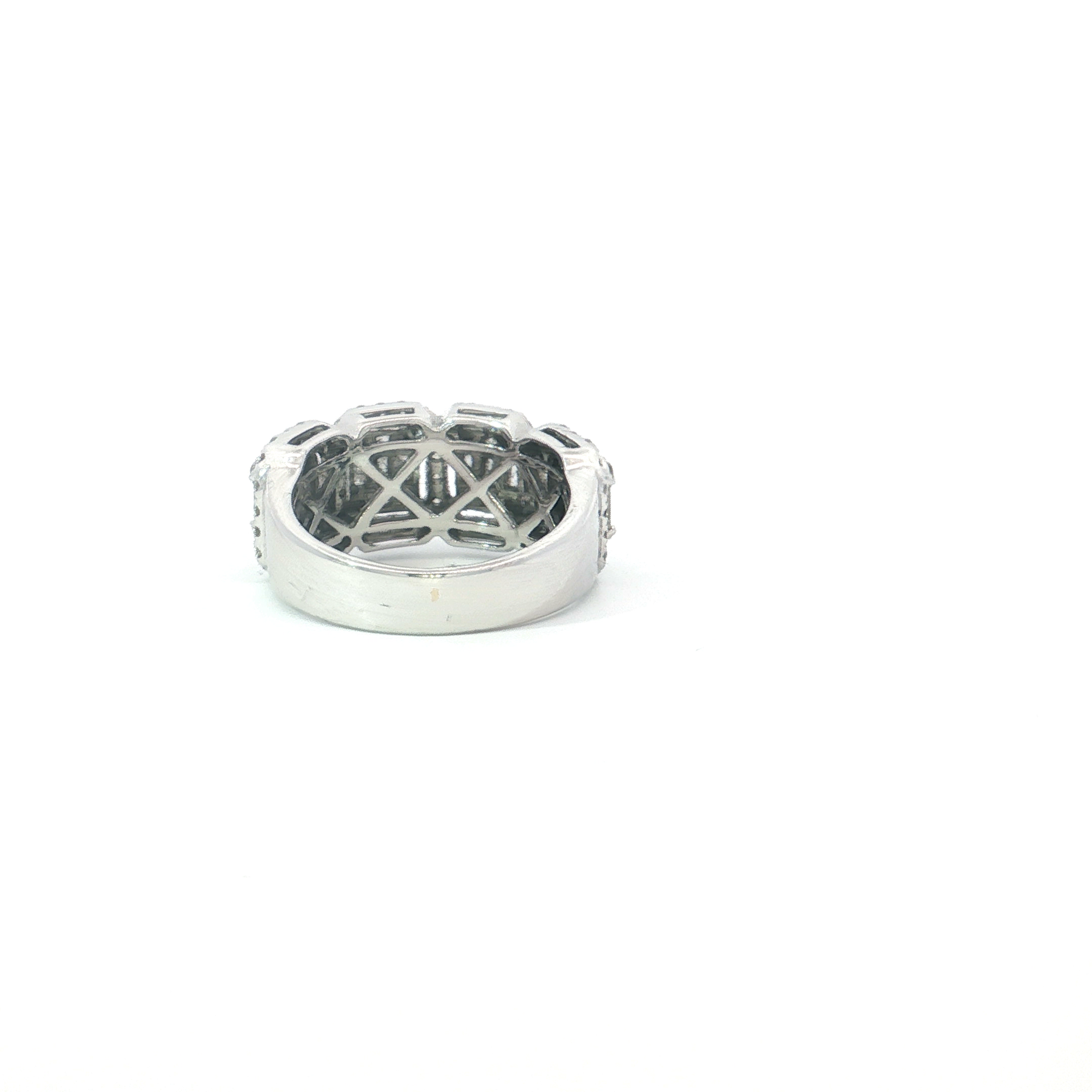 Indulge in the allure of this white gold multistone ring, featuring emerald-cut diamonds in a step-cut style. The meticulous arrangement and composition of stones showcase the ring's superior craftsmanship. A mesmerizing statement piece, it encapsulates timeless design and sophisticated elegance. Perfect for adding a dash of brilliance to any ensemble.
