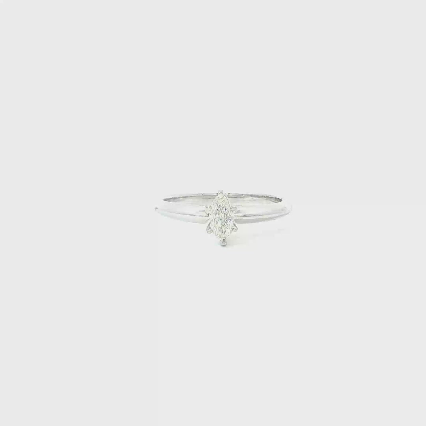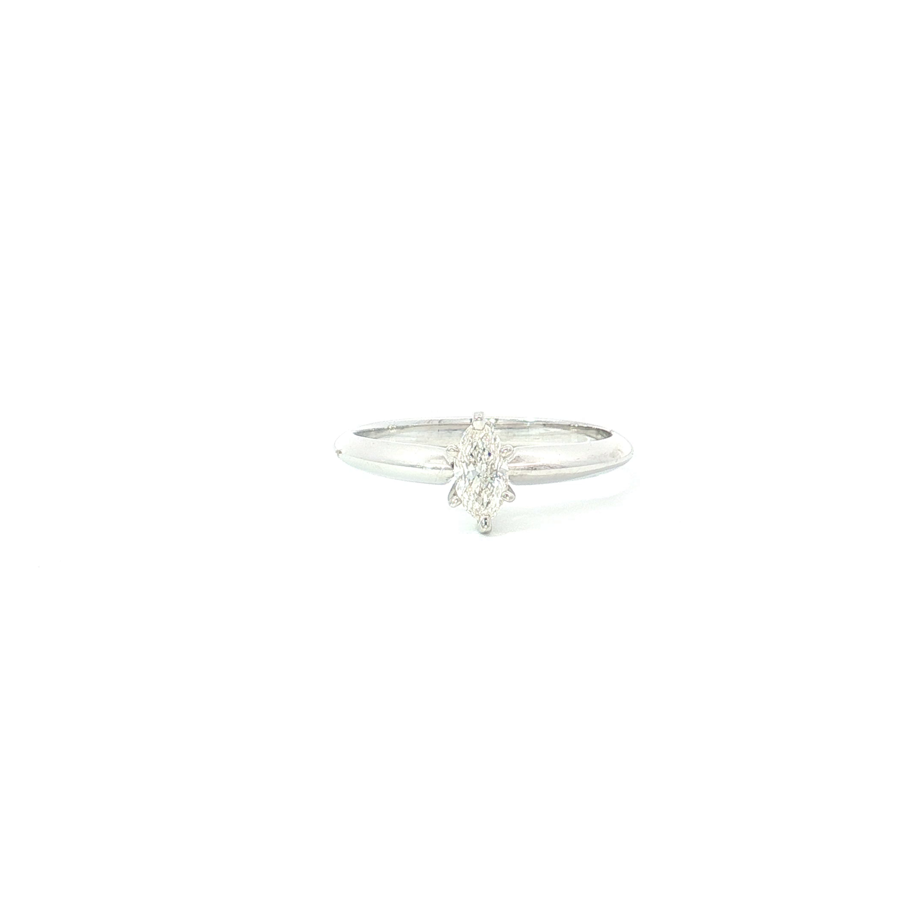Exude timeless elegance with this refined platinum solitaire ring. A marquise-cut diamond takes center stage, its brilliant facets creating a captivating sparkle. The sleek white gold band ensures a comfortable fit and enhances the stone's radiance, making it an ideal choice for celebrating life's precious moments.