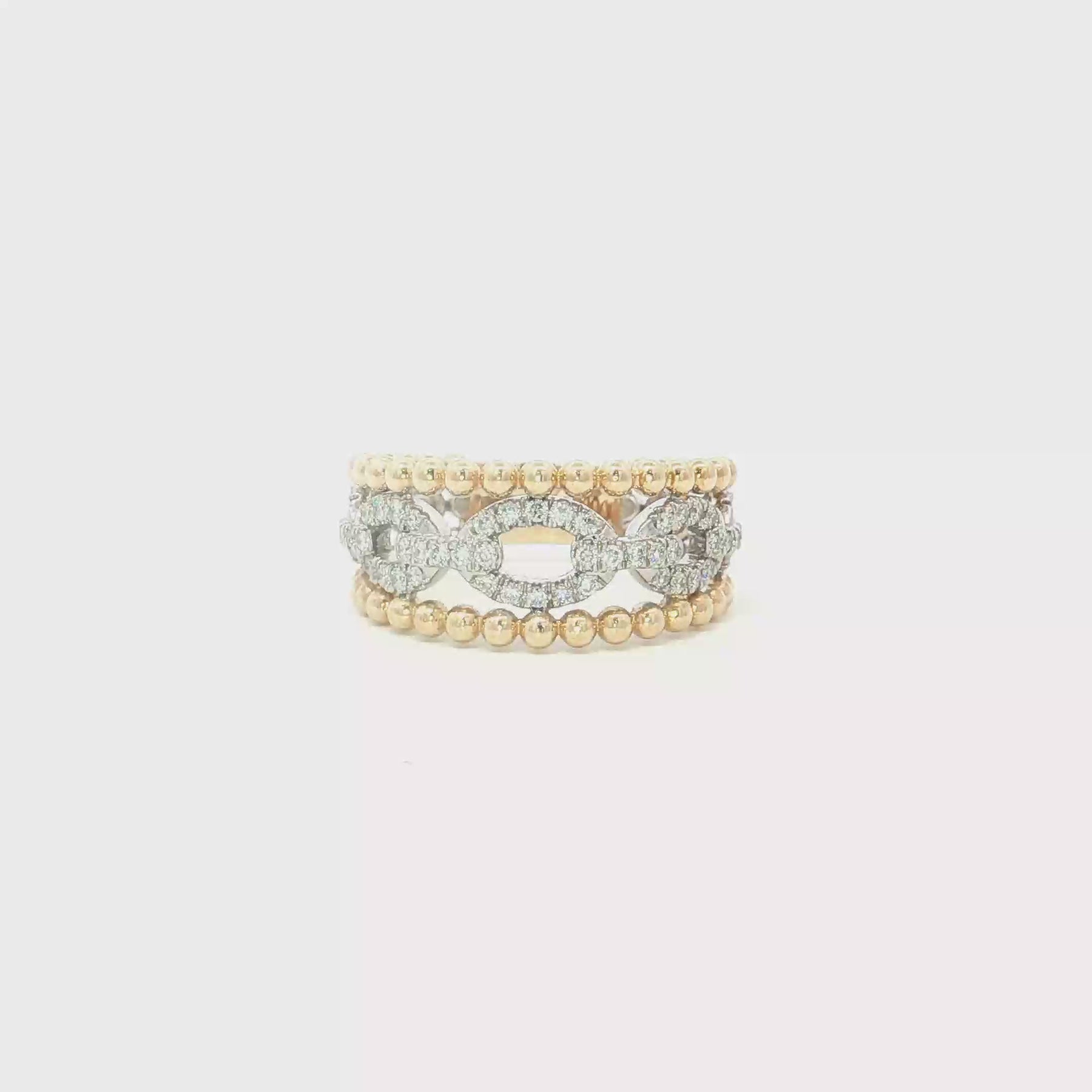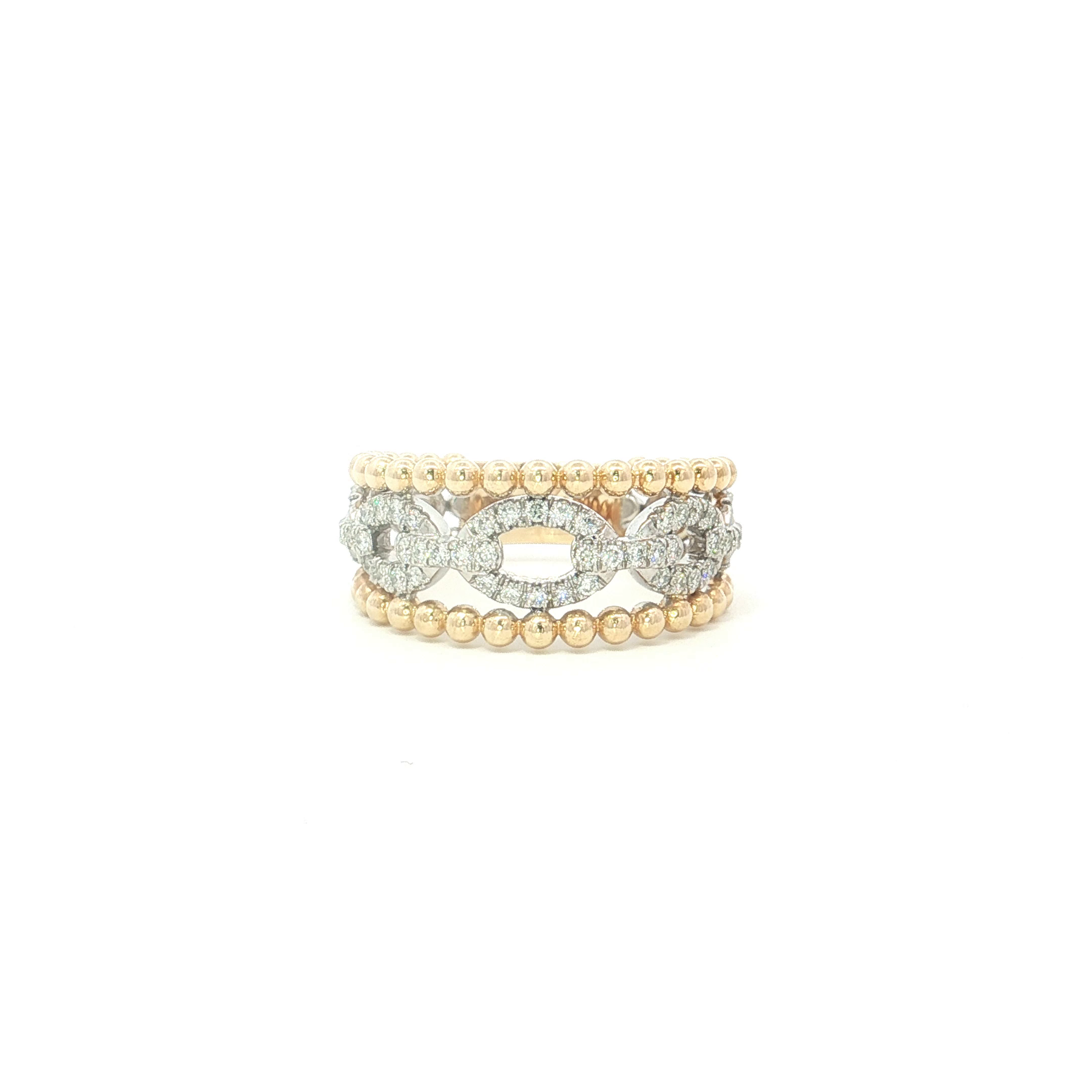 Exquisitely crafted, this white and yellow gold band ring features an openwork design embellished with a halo of round brilliant diamonds. This ring is more than an accessory, it's a statement piece radiating timeless elegance and sophistication.