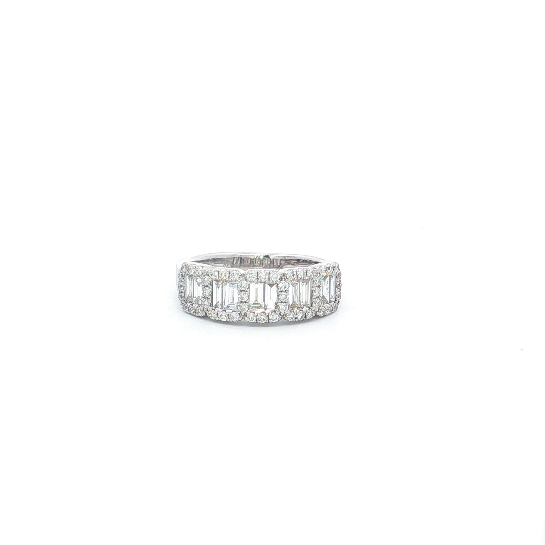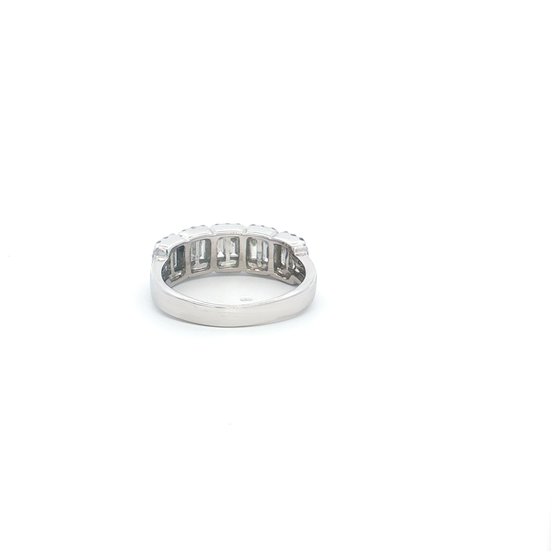 Exquisite emerald-cut colorless diamond eternity ring, crafted in lustrous white gold. The ring showcases a seamless row of step-cut diamonds, each meticulously set to maximize brilliance and fire. A timeless and elegant piece, perfect for celebrating enduring love.
