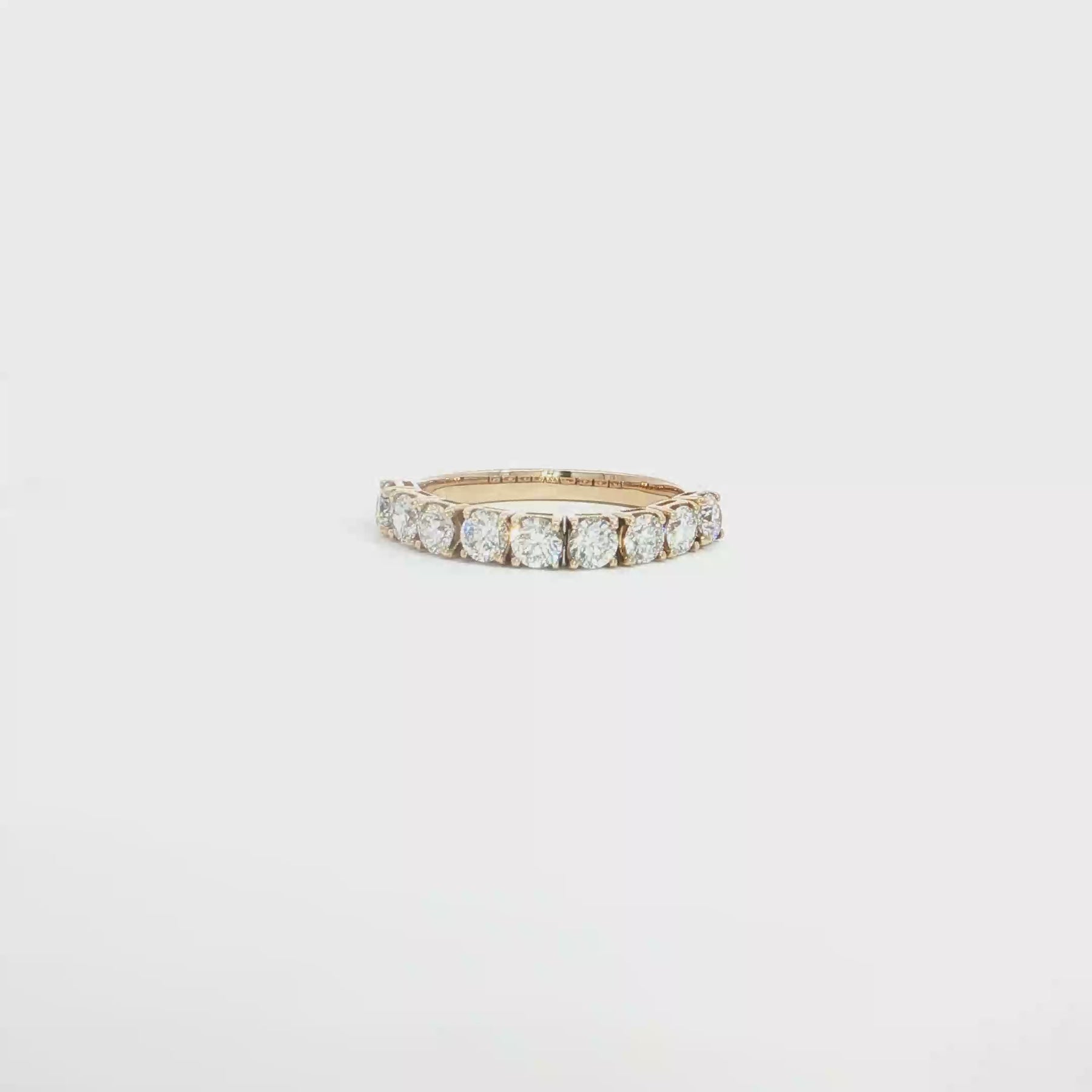 Exquisite yellow gold eternity ring featuring a continuous row of round cut diamonds. The diamonds are meticulously set to maximize brilliance and fire, creating a seamless circle of light. This sophisticated ring symbolizes everlasting love and commitment, perfect as a wedding band, anniversary gift, or a timeless addition to any fine jewelry collection.