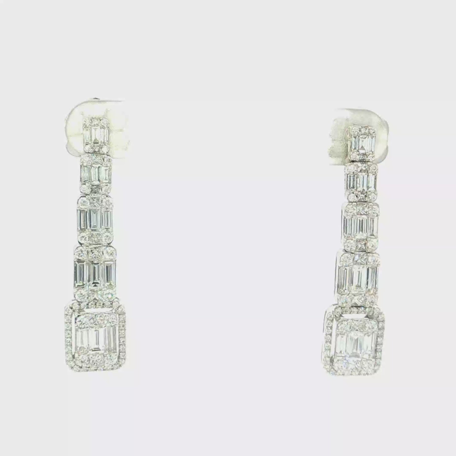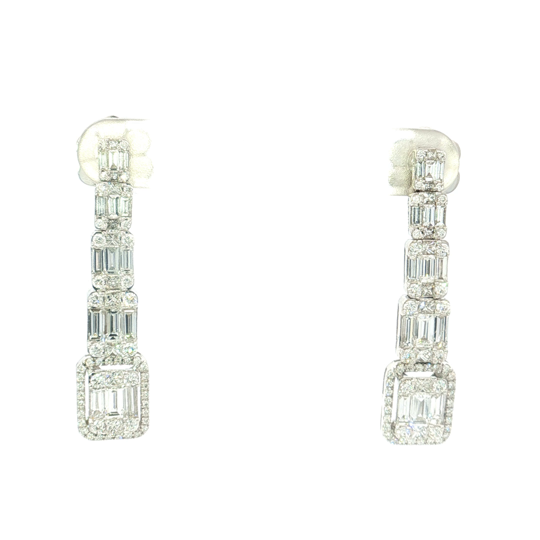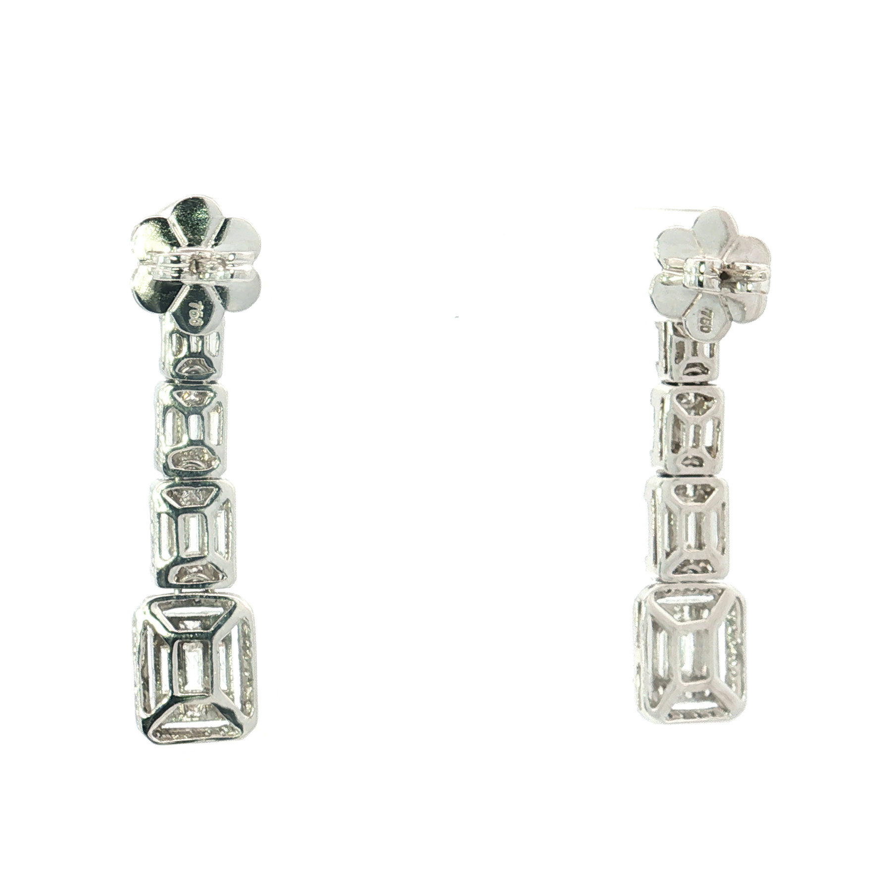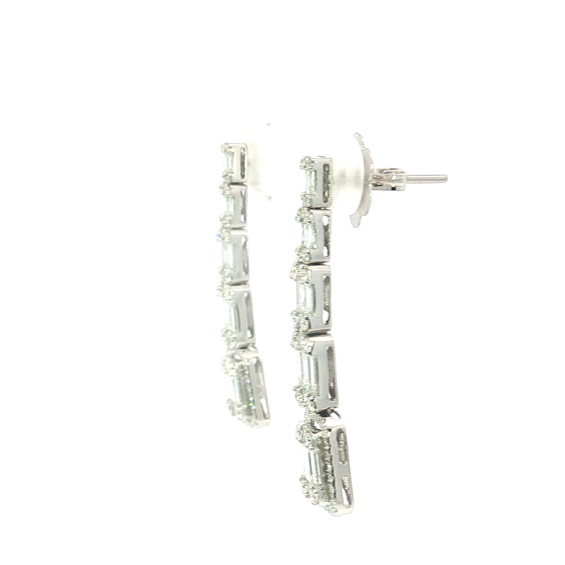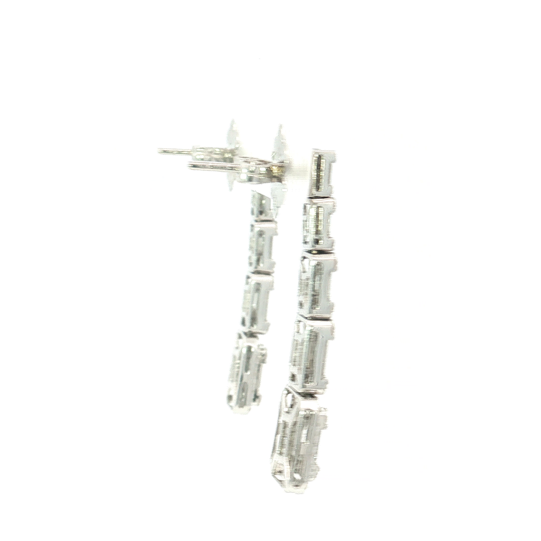 Elevate your elegance with these exquisite platinum dangle earrings. Each earring features meticulously step-cut, emerald shaped diamonds, known for their exceptional brilliance and clarity. A classic design is rendered with modern sophistication in lustrous white gold. These earrings are a testament to refined style.
