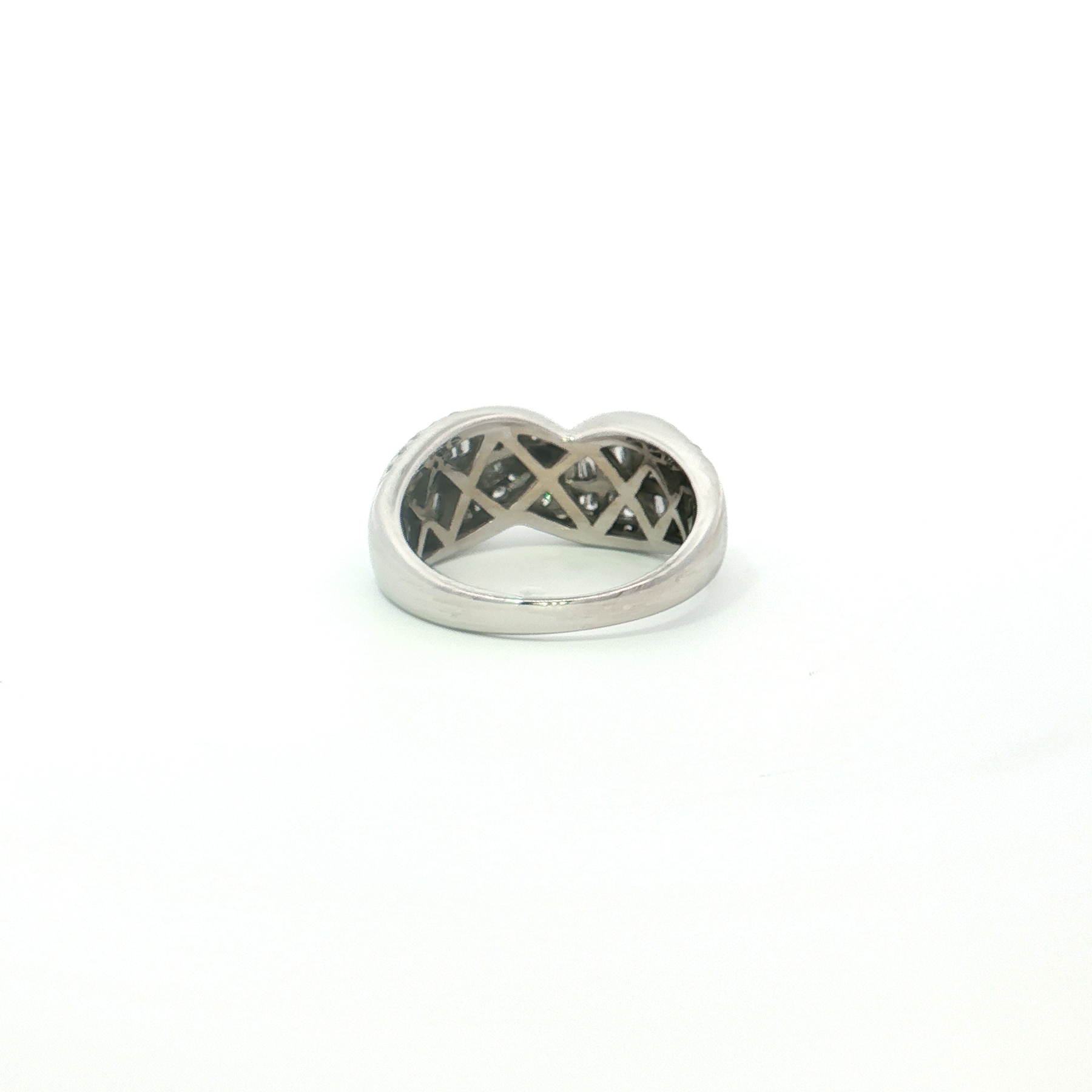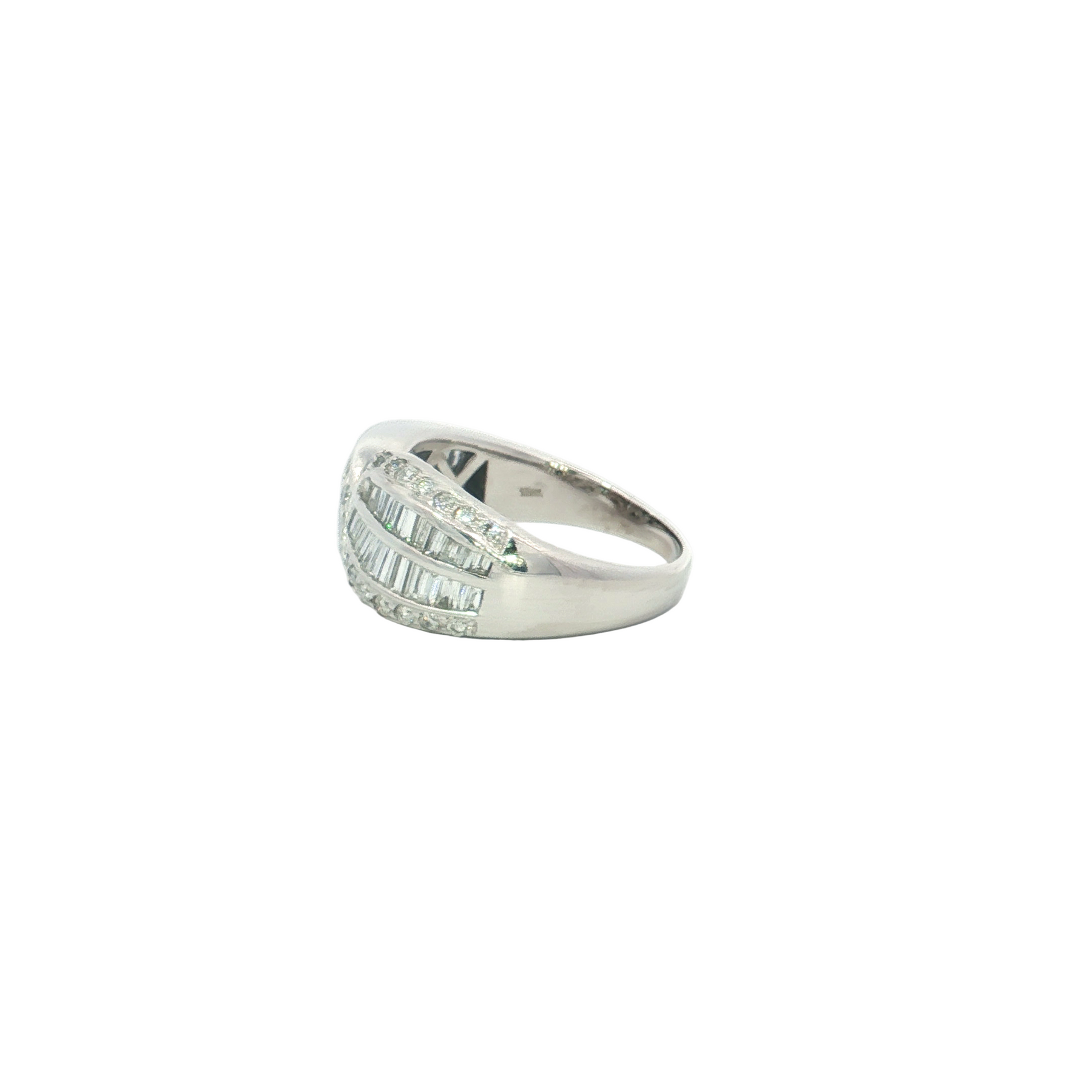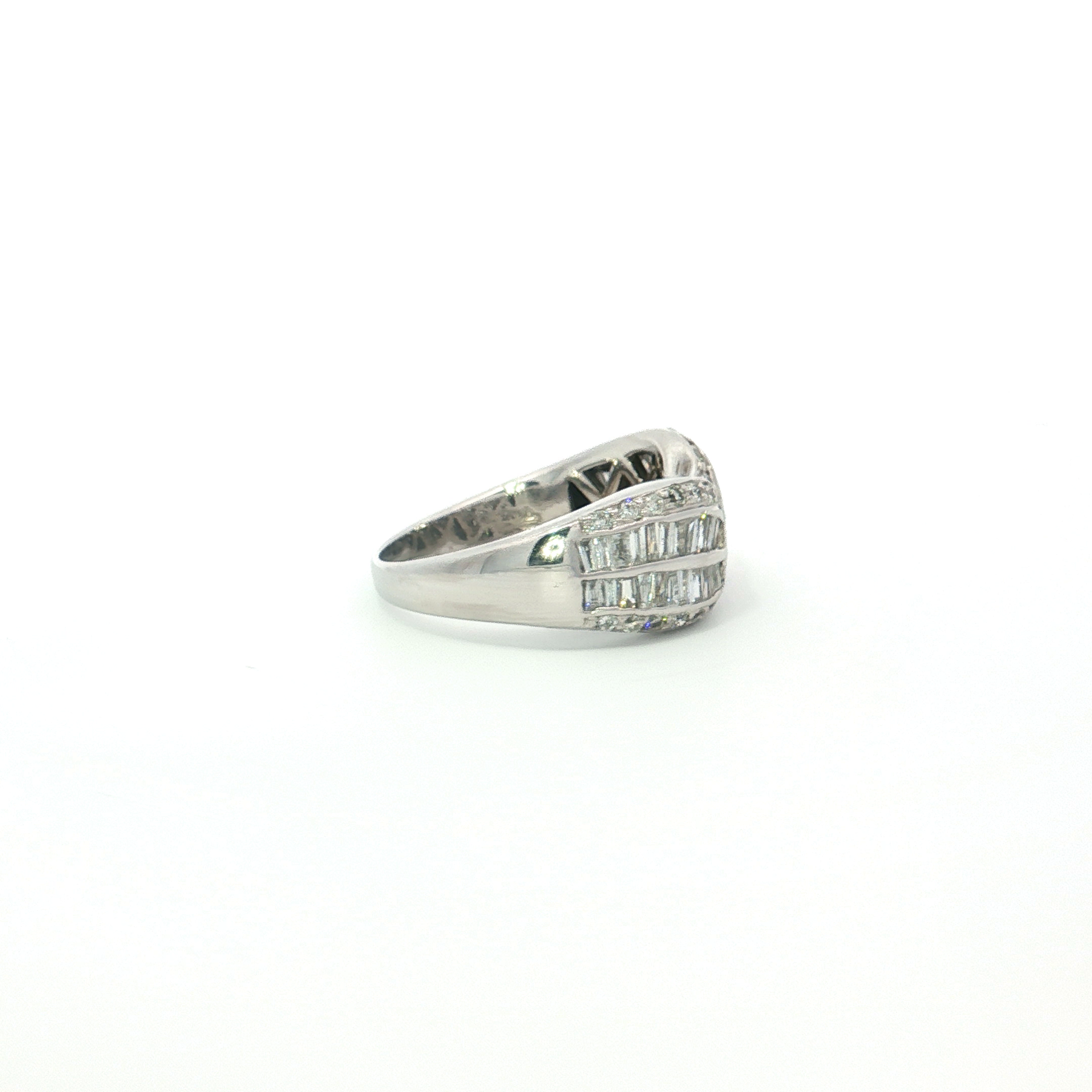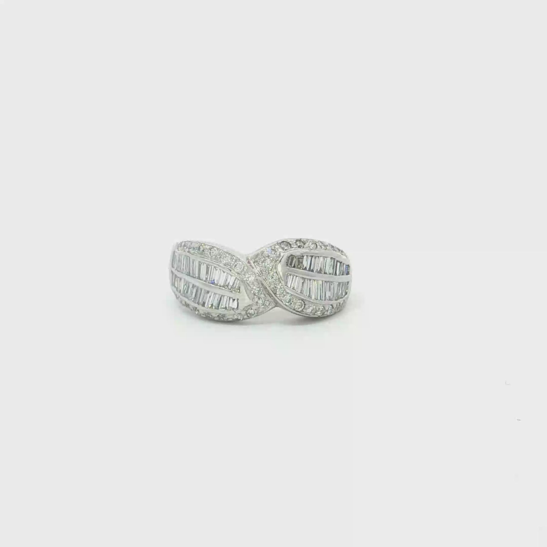 Exquisitely crafted in white gold plated silver, this captivating multistone ring showcases a mesmerizing array of baguette cut colorless diamonds. The step cutting style of these diamonds enhances their brilliance and scintillation. A testament to timeless elegance, this ring makes a sophisticated statement on any finger.