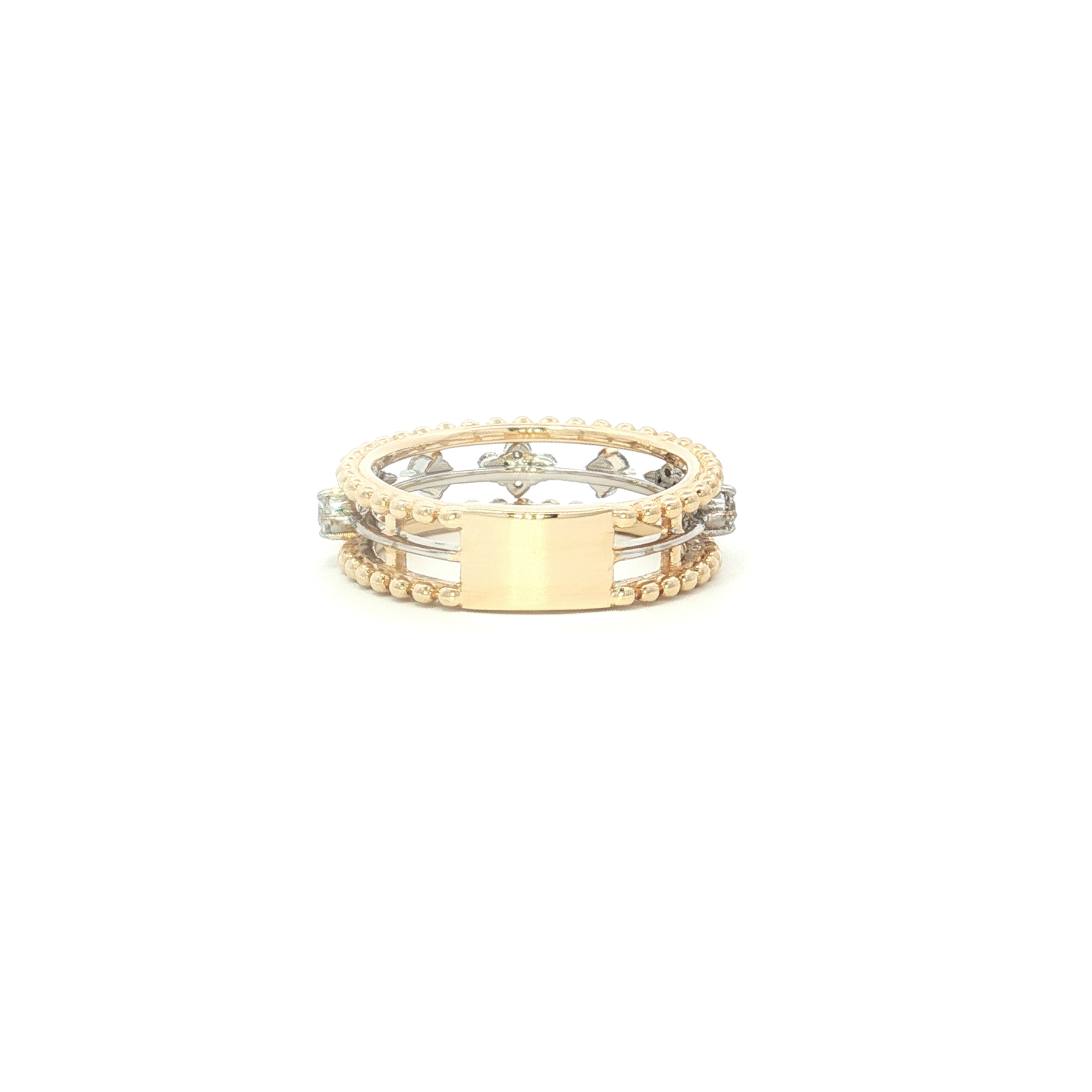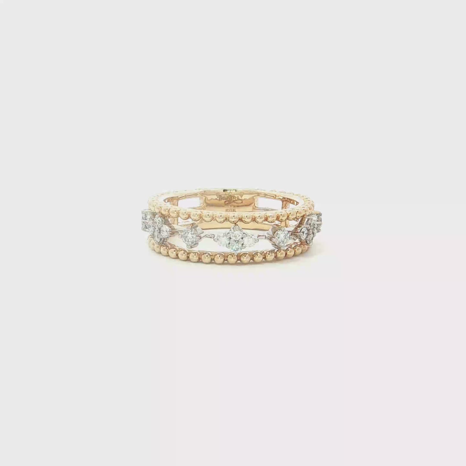 Exquisite multi-stone ring crafted in radiant yellow gold, showcasing a series of brilliant-cut round diamonds. This ring features a distinctive beaded design, adding a touch of elegance and texture. The setting enhances the diamonds' sparkle, creating a captivating play of light. Perfect for adding a refined touch to any ensemble.